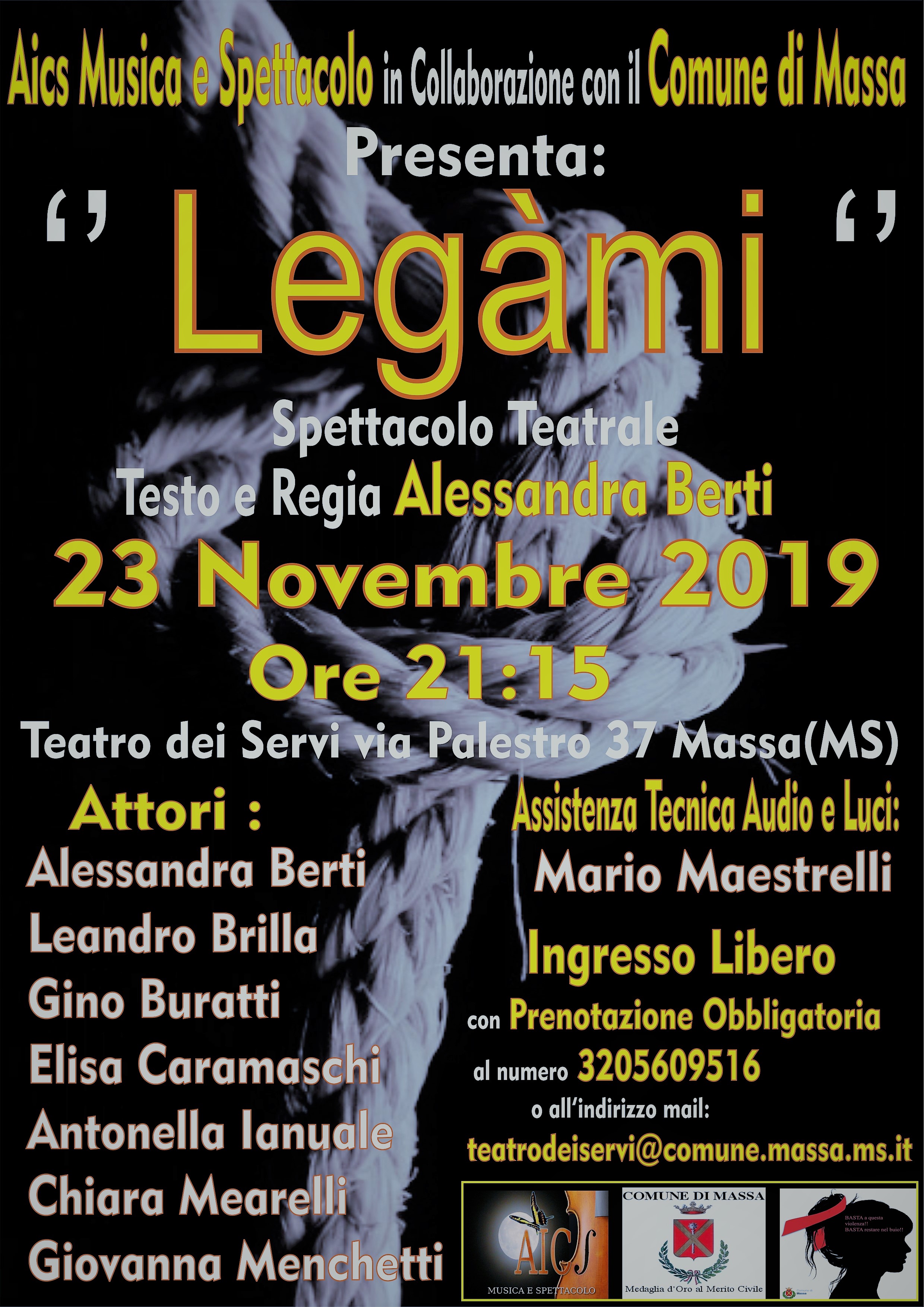 Ingresso libero con prenotazione obbligatoria al numero 3205609516 o all'indirizzo mail teatrodeiservi@comune.massa.ms.it.